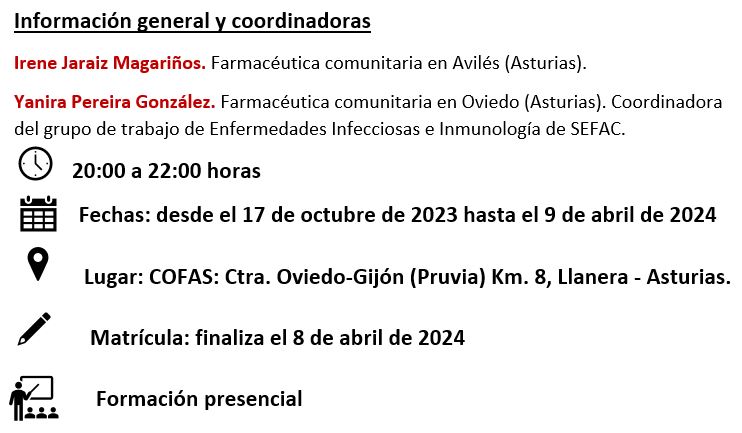 • Recordar a los alumnos protocolos de actuación en farmacia comunitaria en estas patologías y los tratamientos para las mismas, incidiendo en los tratamientos más actuales para poder responder con seguridad y calidad a las preguntas de los pacientes, así como, en estrategias de prevención y mejora de la calidad de vida de los pacientes.